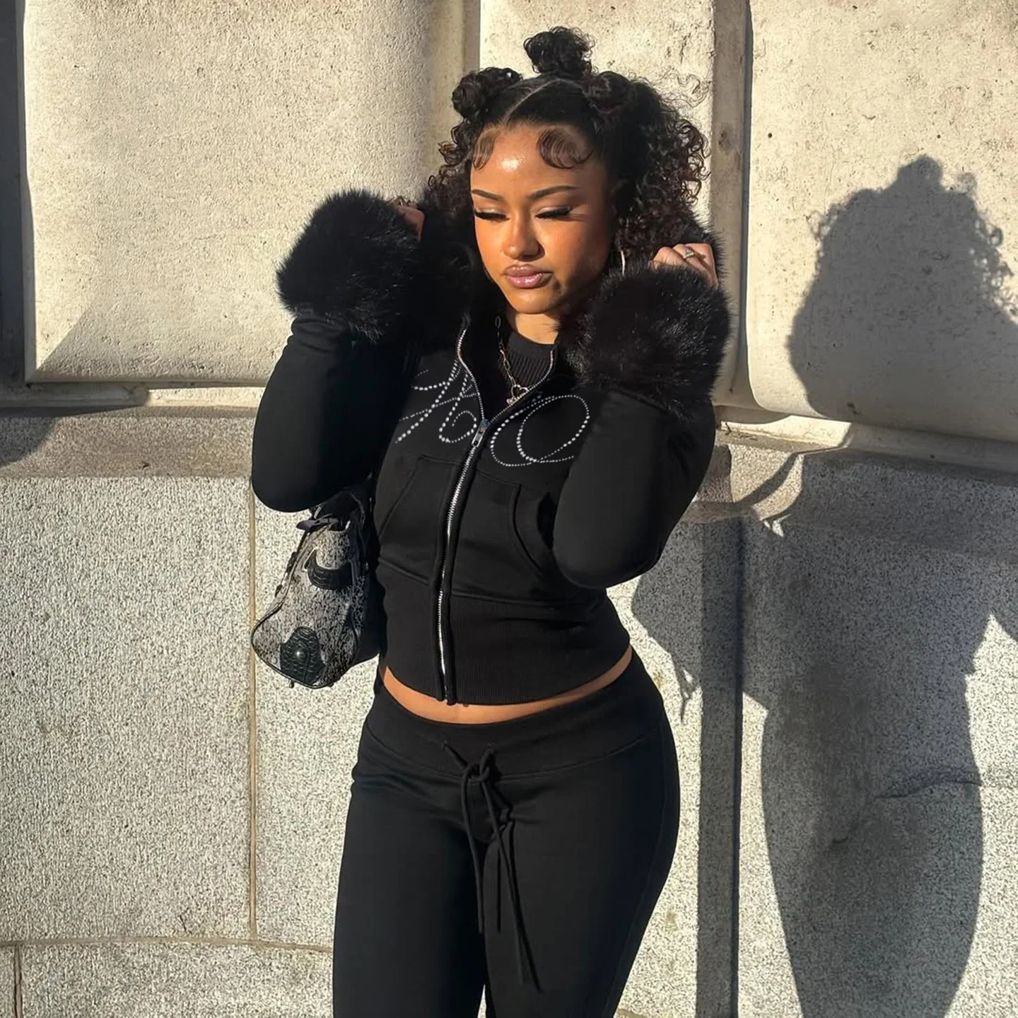 This matching Y2K tracksuit set is designed to give you that effortless “off-duty model” look with a glam twist. Featuring a fitted zip-up hoodie with faux fur trim and low-rise flare pants, it hugs your shape while keeping you comfortable all day.