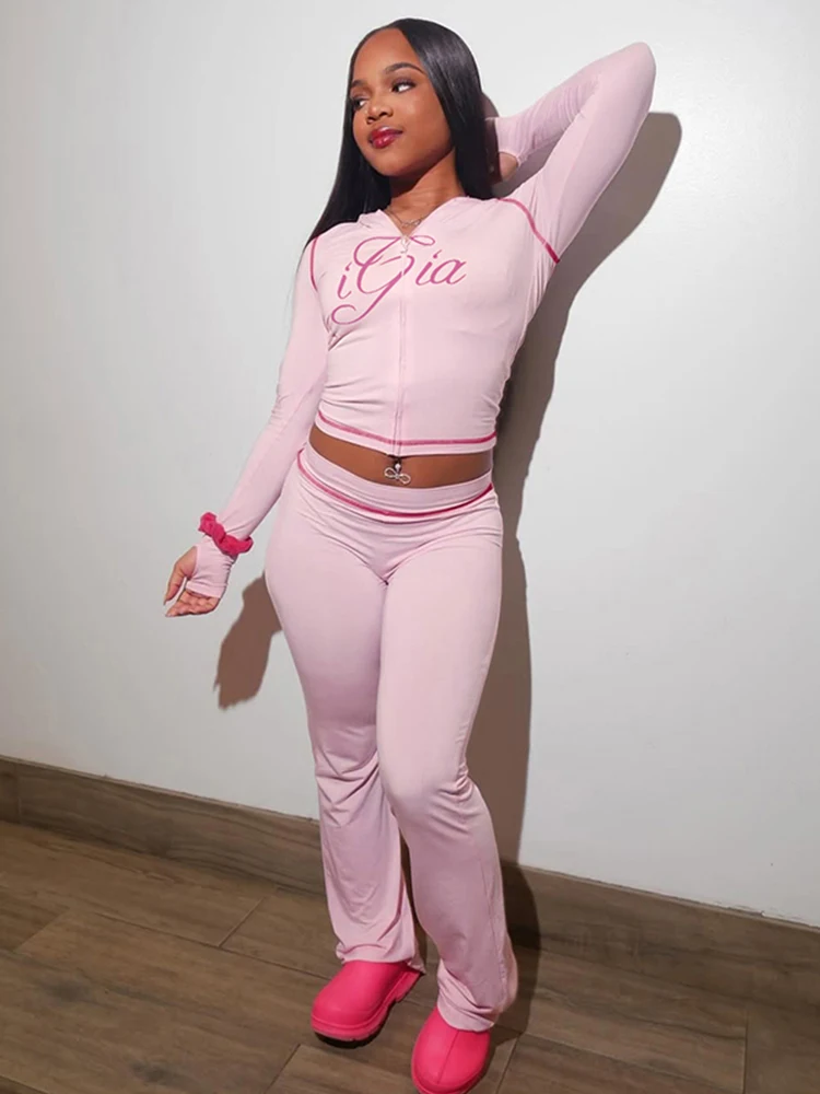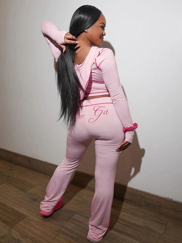 This Y2K-inspired tracksuit set features a fitted zip-up hoodie paired with flared pants. The pink design with contrasting details gives a trendy, streetwear-inspired early 2000s look with a feminine touch. Made from comfortable, stretchy fabric for all-day wear.